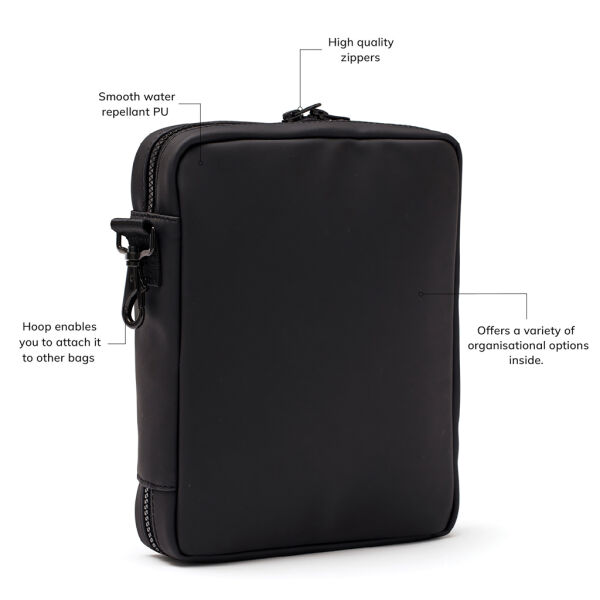 Houd alle benodigdheden bij de hand met deze handige organizer. Hier heb je ruimte voor alles wat je overdag nodig hebt, zoals een koptelefoon, powerbank, pennen en notitieboekjes. Met de karabijnhaak aan de korte zijde bevestig je de organizer aan een grotere tas.